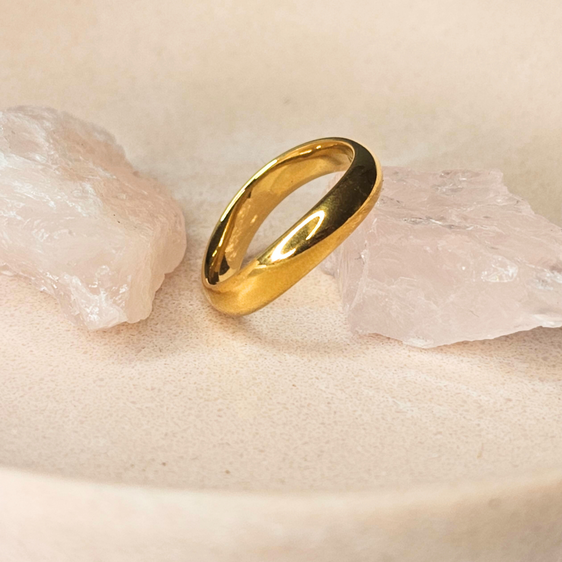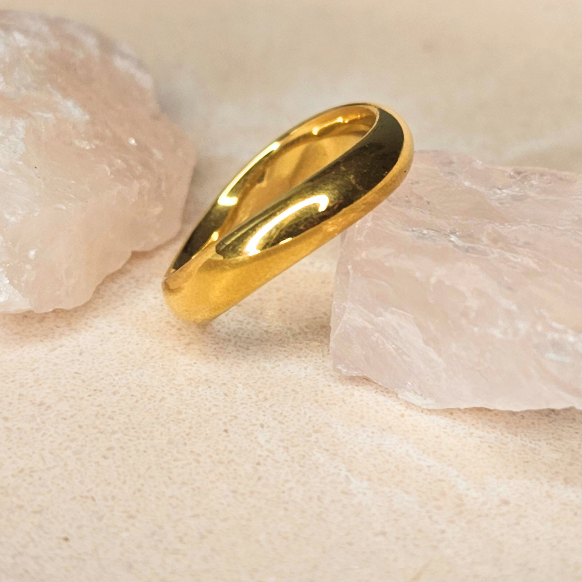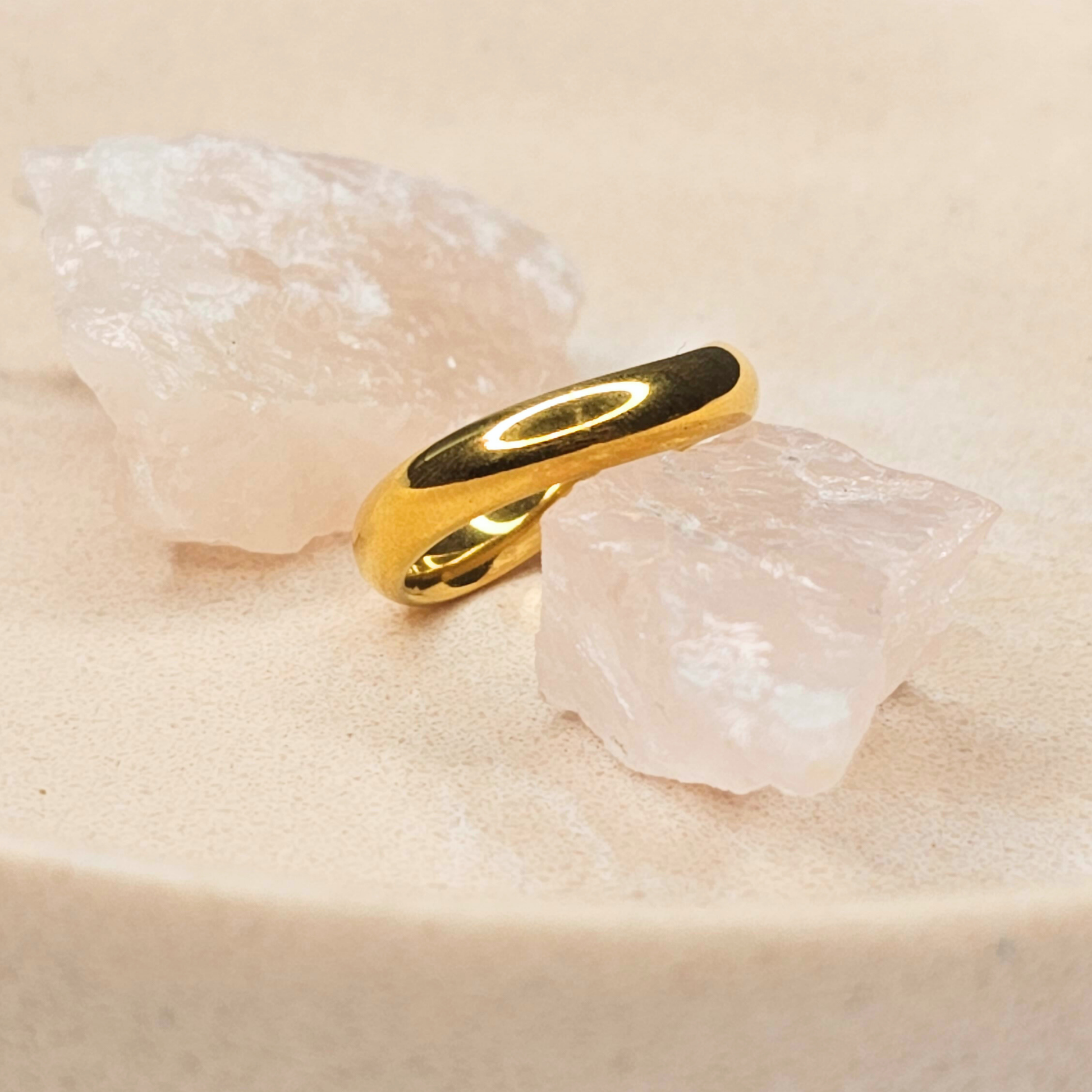 The Stan Ring is the perfect embodiment of modern minimalism, featuring a smooth, curved design that radiates understated elegance. With its bold silhouette and flawless 18K gold-plated finish, this ring offers timeless style that effortlessly transitions from day to night.