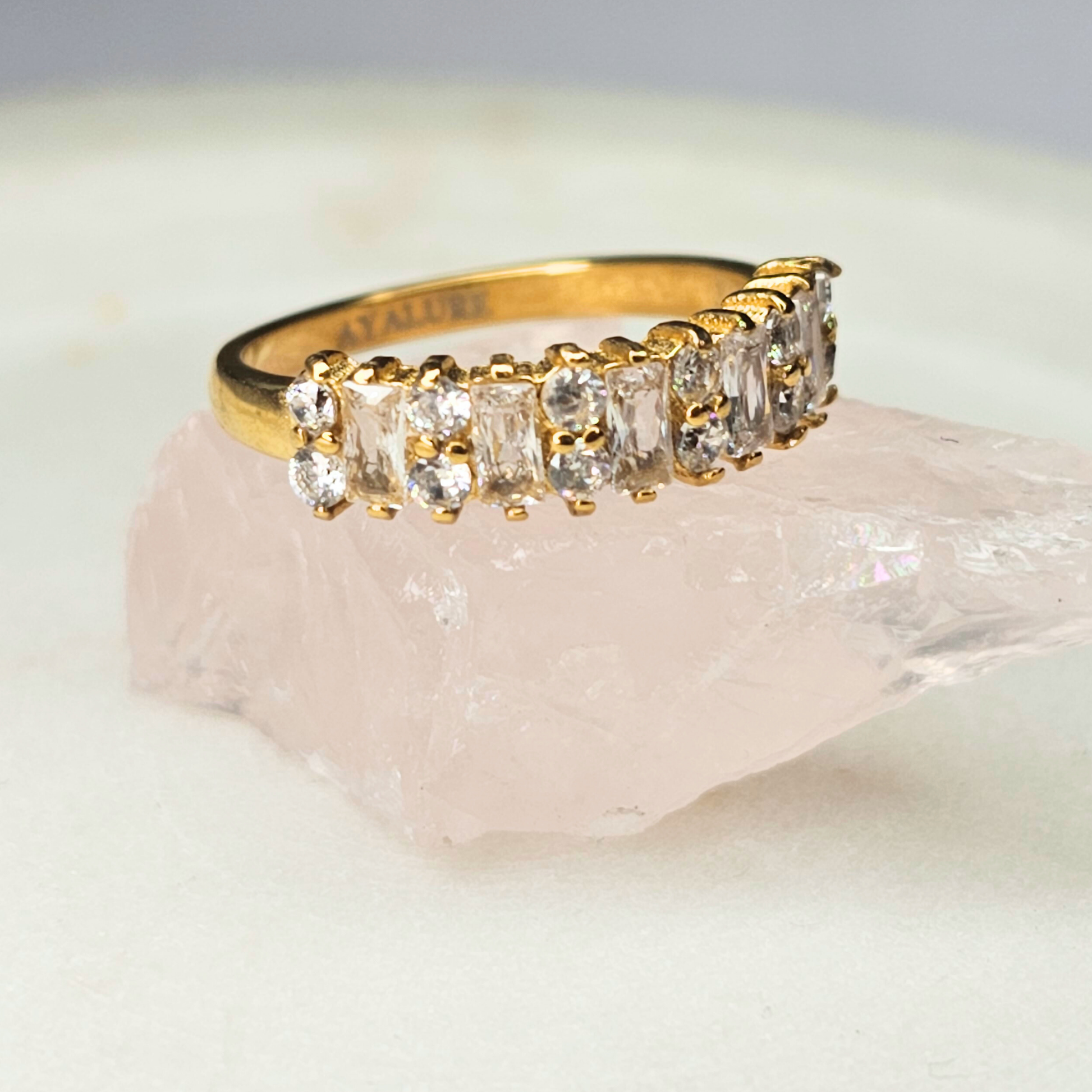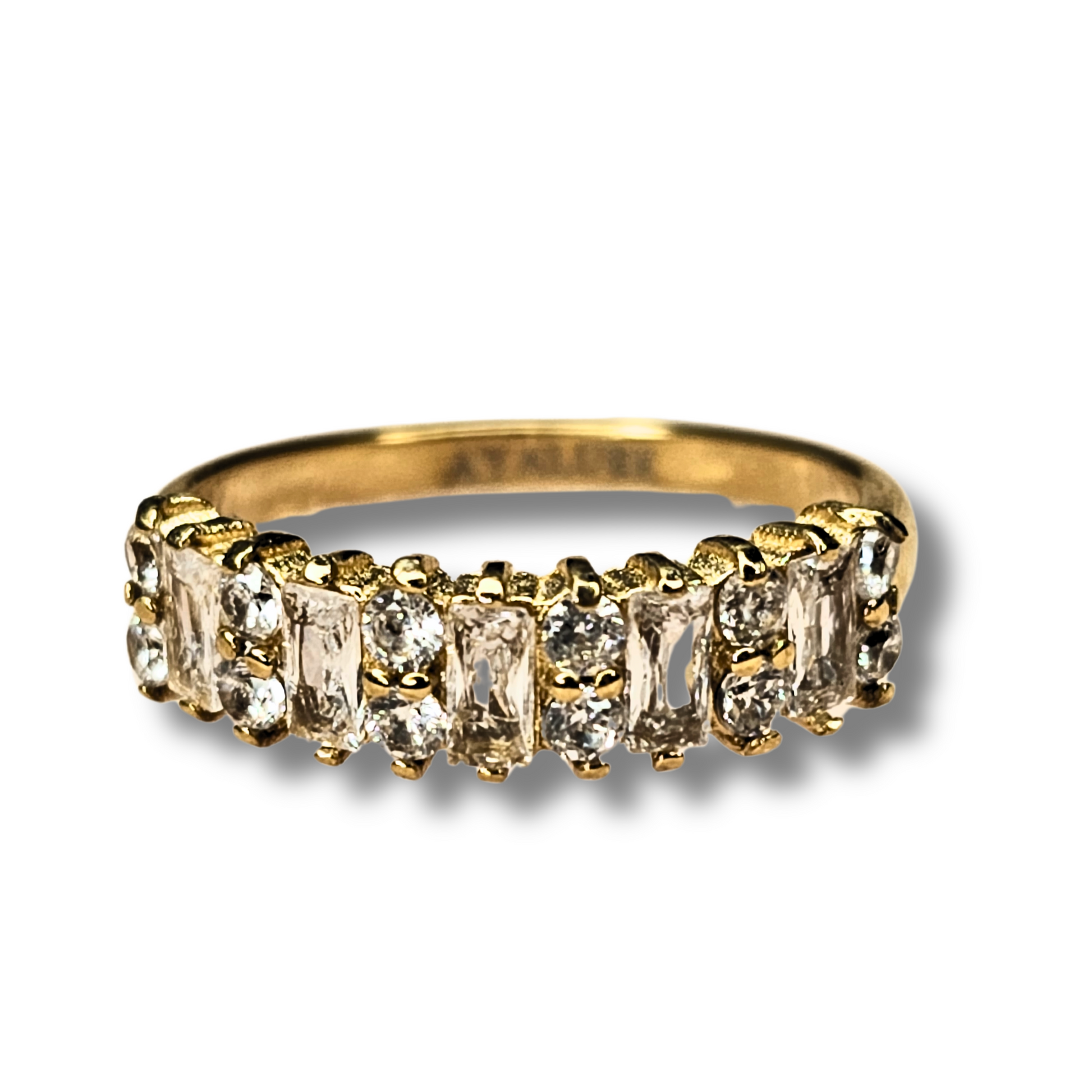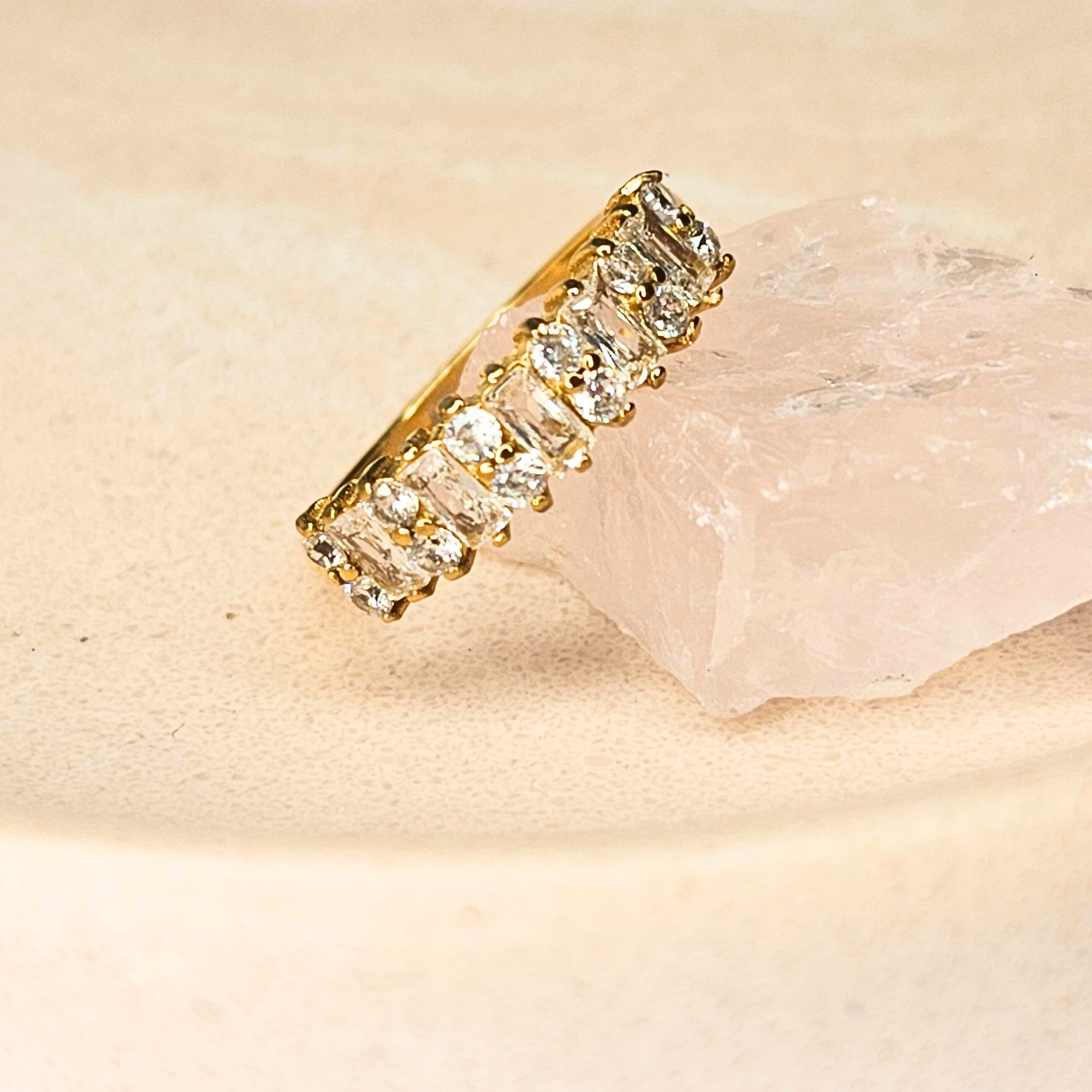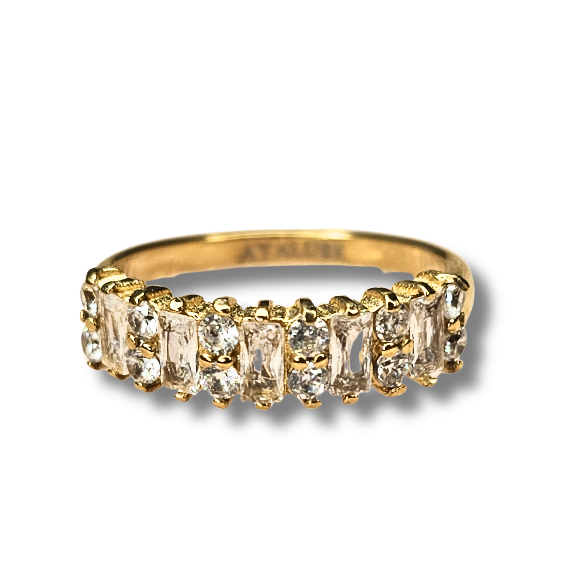 Add a touch of luxury and sophistication to your collection with the Newy Ring. This exquisite piece features a stunning array of baguette and round-cut stones set into a sleek, polished 18K gold-plated band. The combination of cuts creates a