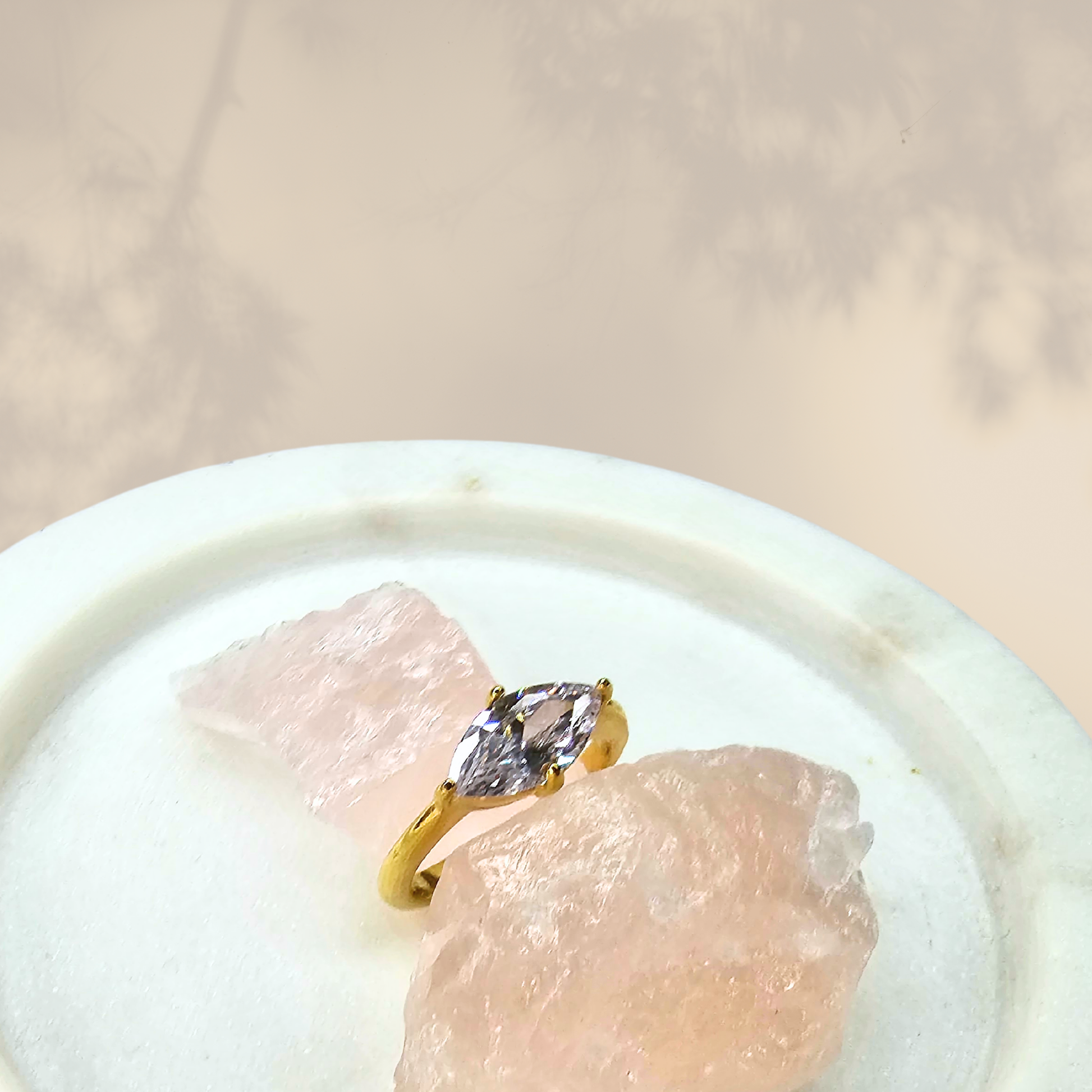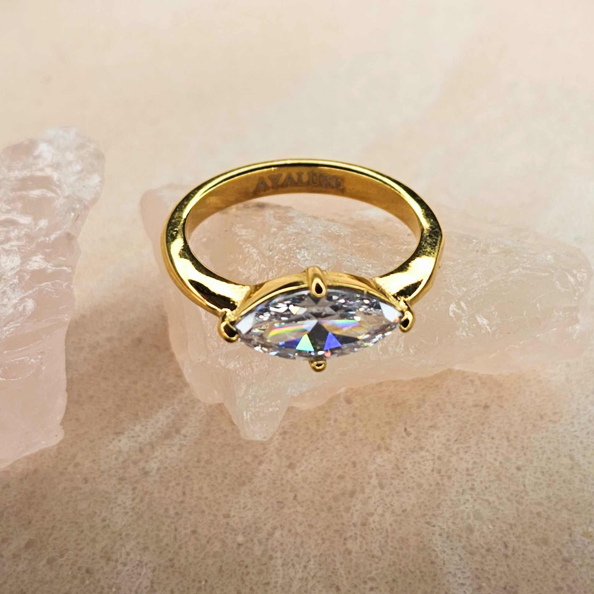 Radiate confidence with the Kristy Ring, a stunning marquise-cut stone set on an 18K gold-covered band that blends classic brilliance with modern elegance. The unique marquise-cut stone reflects light beautifully, making it a show-stopping piece for those who love jewelry