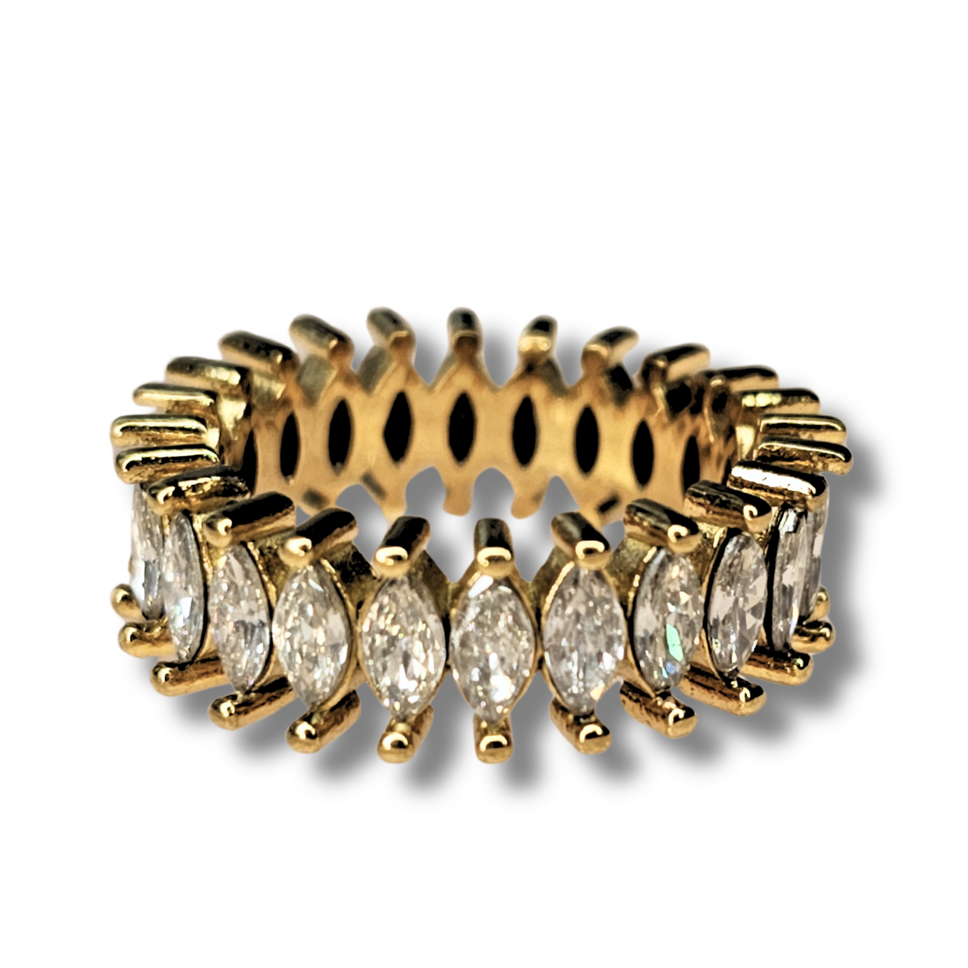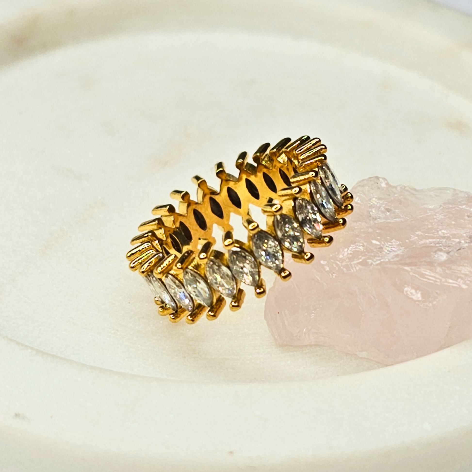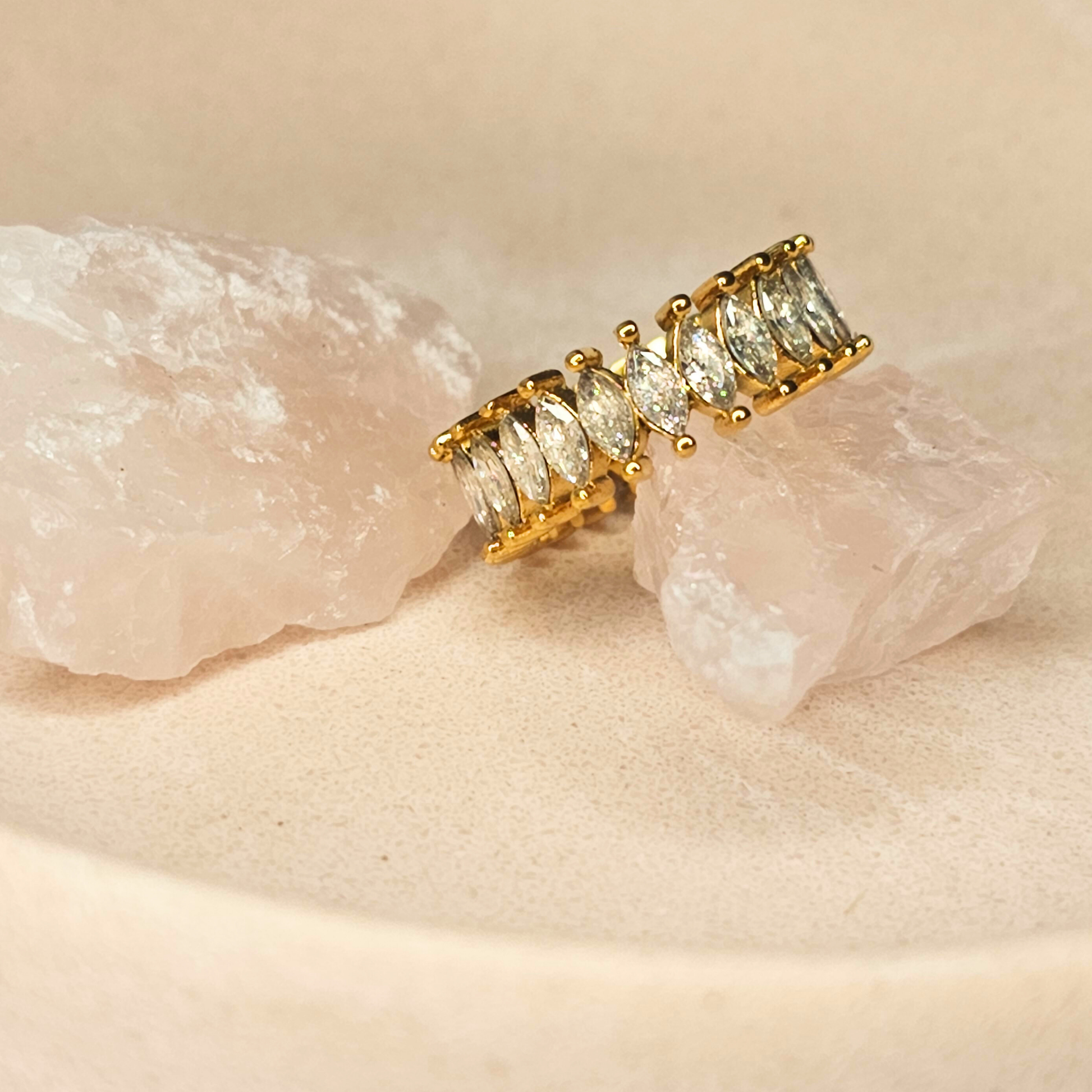 Make a statement with the Kil Ring, a dazzling piece designed to catch every eye. Featuring a continuous row of marquise-cut stones set into an 18K gold-plated band, this ring radiates sophistication and luxury. The intricate detailing of the stone